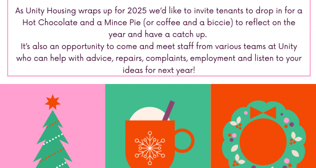 As Unity Housing wraps up for 2025 we’d like to invite tenants to drop in for a Hot Chocolate and a Mince Pie (or coffee and a biccie) to reflect on the year and have a catch up.